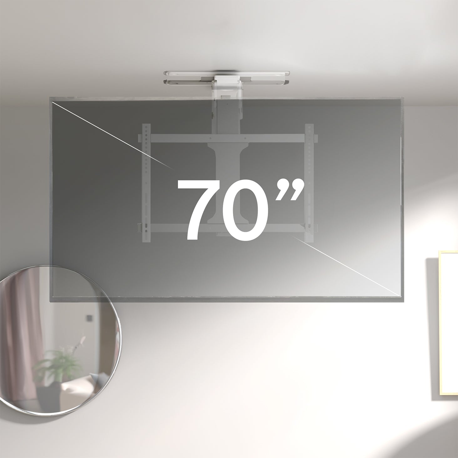 Enhance your visual display with the Electric Flip Down / Swivel Ceiling TV Mount (MOUNT-E-FD70S Series) from VIVO! This heavy-duty motorized large TV mount is the perfect space-saver that installs to flat ceilings and other surfaces. The motor is controlled with an included RF remote featuring programmable memory settings to save your favorite viewing angles. You can also connect to the Tuya app, Amazon Alexa, or Google Home for app control or voice control options right from your mobile device! The fold-up design fits flat surfaces allowing for easy storage, cleared-up space, and out-of-way safety. Features include solid steel construction for durability, motorized swivel and height adjustment for comfortable viewing angles, screen tilt for glare reduction, and a removable VESA plate for easy mounting.