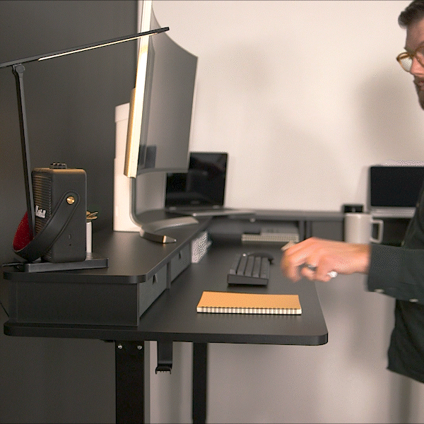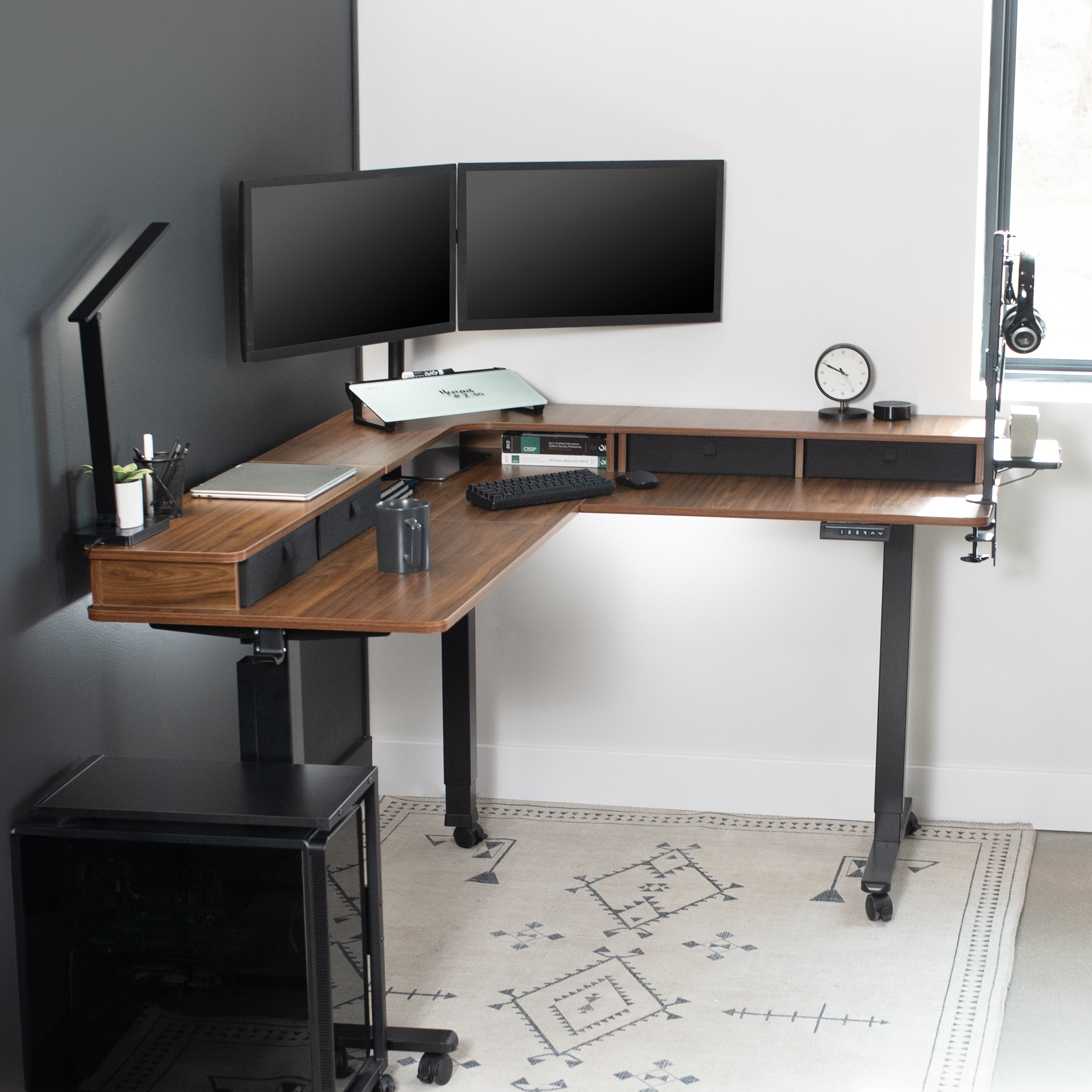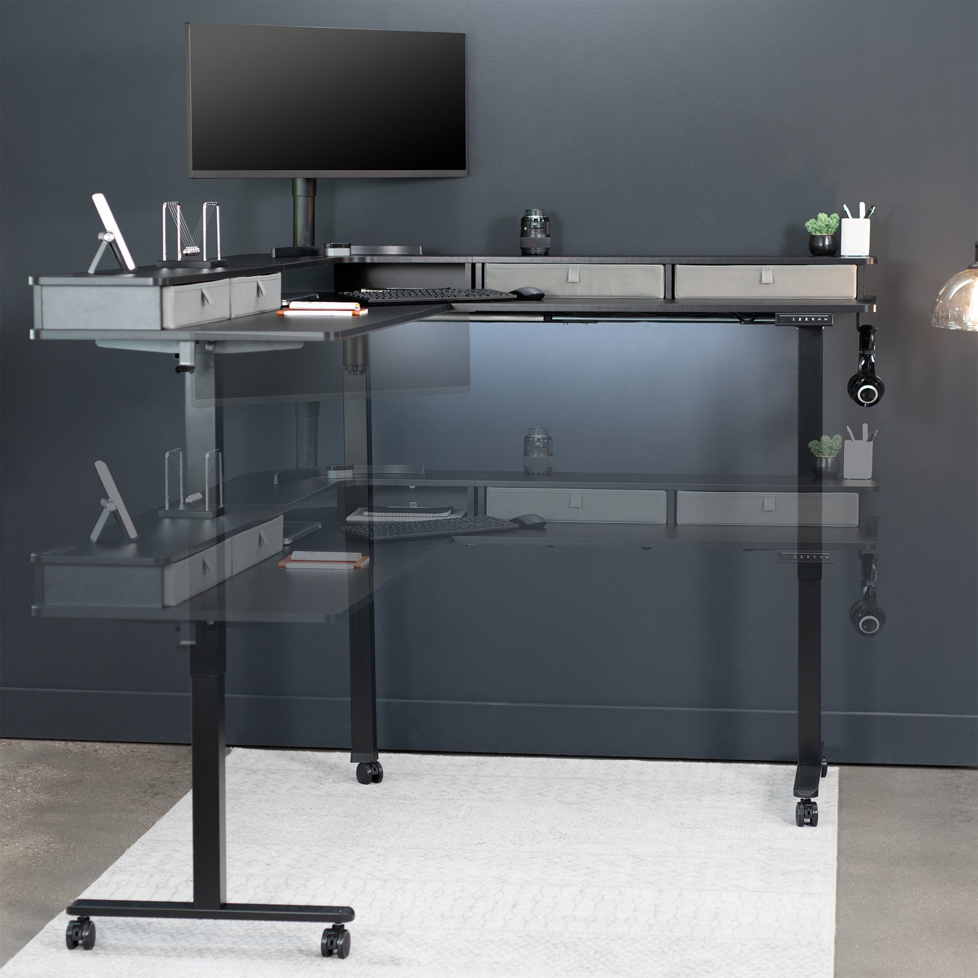 Add more storage and organization to your setup with this innovative dual-tier electric desk. The 10.7" deep second tier is perfect for achieving an ergonomic viewing angle for your monitors without the need for additional mounts or stands. Keep all of your accessories tucked away under the second tier with built-in fabric drawers and an open middle section for keyboards, laptops, and more. The spacious l-shape design is ideal for corner setups and creates much-needed space to let the creative juices flow.