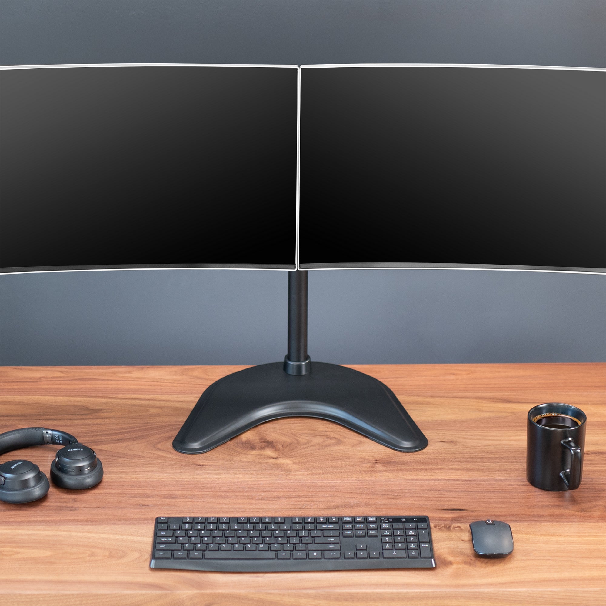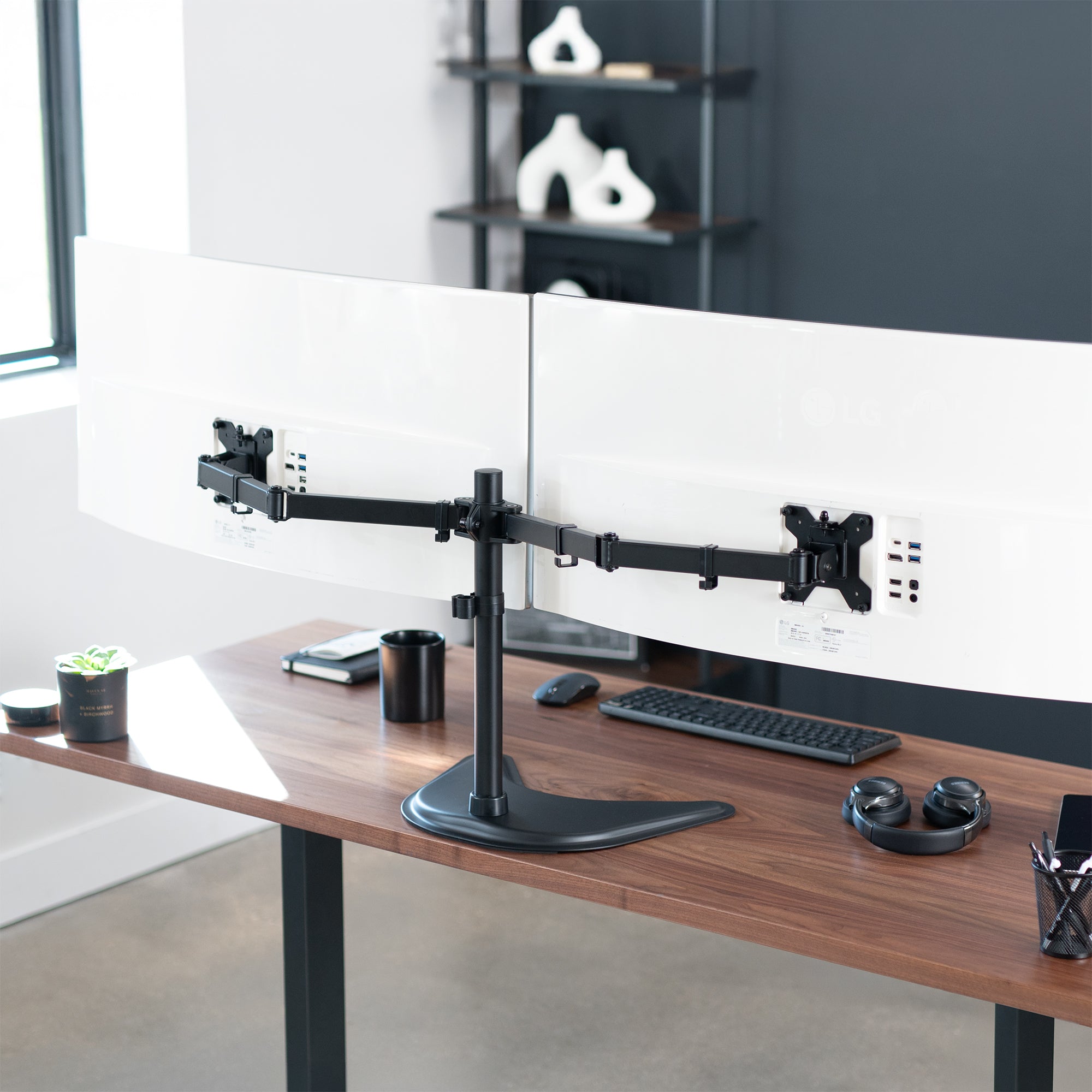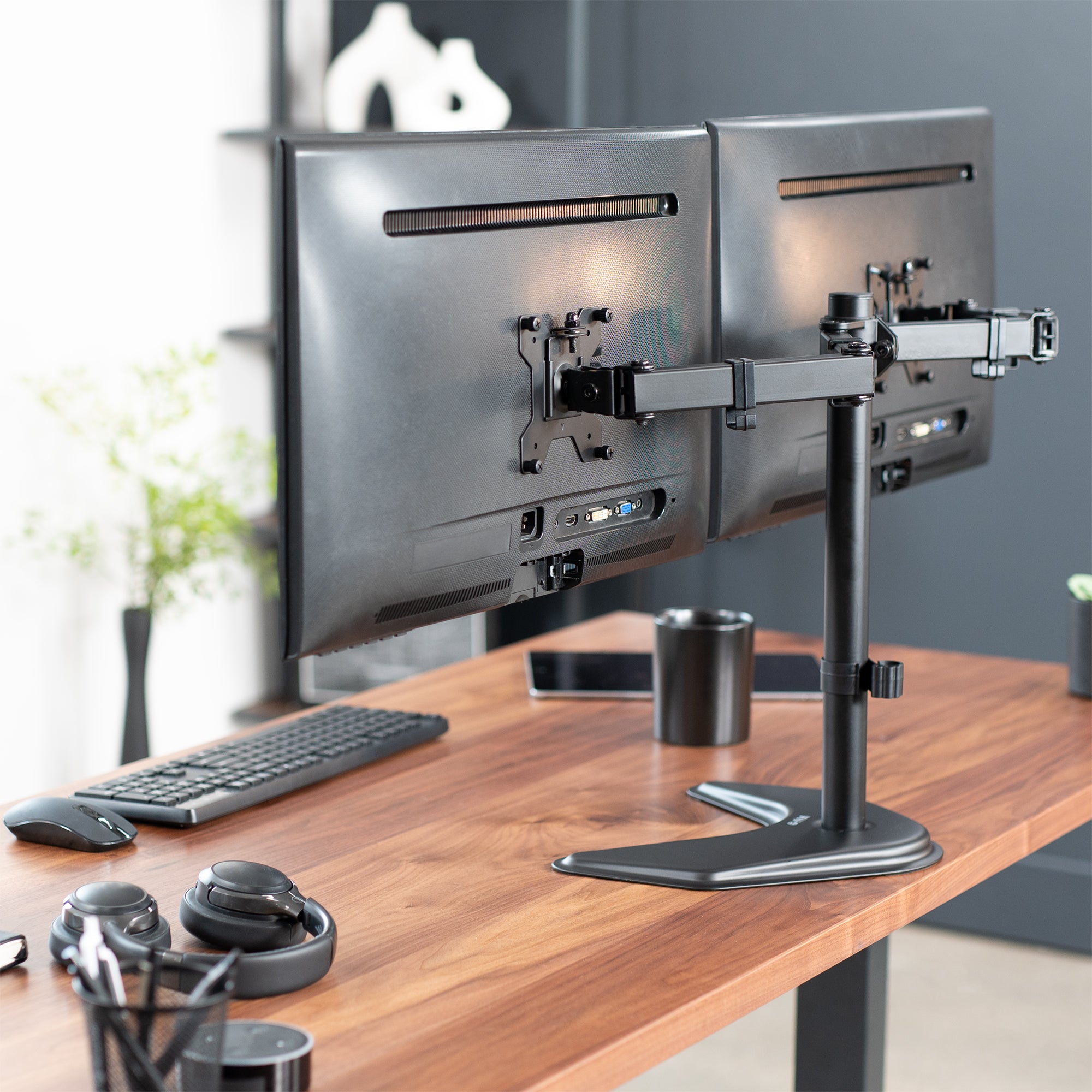 Enhance your monitor display and enjoy ergonomic viewing angles with the Dual Monitor Desk Stand (STAND-V002F Series) from VIVO! This heavy-duty stand features arm articulation and monitor height adjustment for optimal screen positioning, removable VESA mounting plates for easy installation, integrated cable management for an organized appearance, and more! The versatility of screen placement allows for ergonomic viewing that encourages proper body posture and helps reduce fatigue and strain on the neck, shoulders, and eyes. The low profile base clears up valuable desk space and holds your equipment safe and secure.