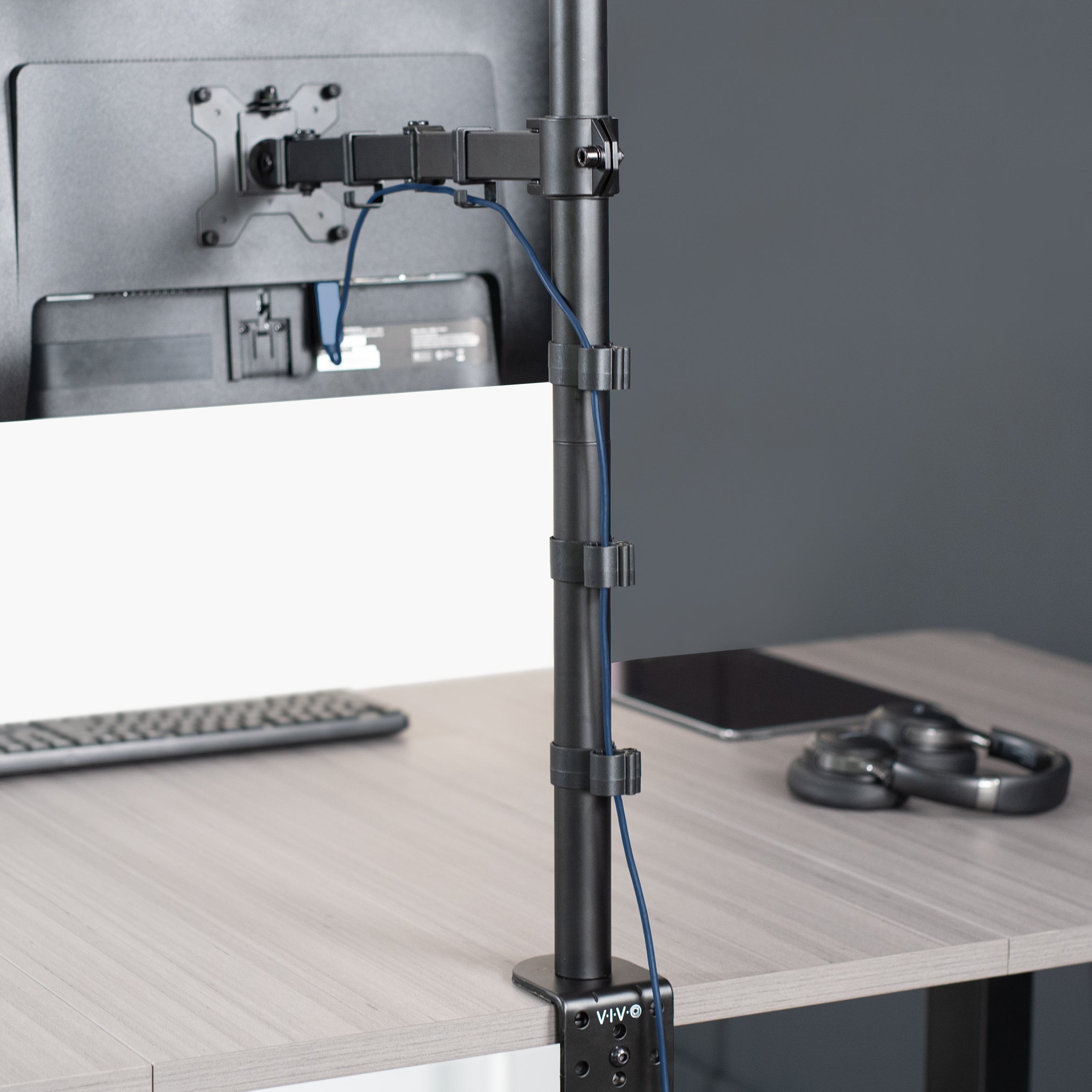 Clear up valuable work space on your desk with Black Single Monitor Extra Tall Desk Mount (STAND-V011) from VIVO! The 39" pole allows the user to adjust from sitting and standing positions. Constructed of high-grade steel, this rugged mount was built to resist scratches and supports screens up to 32" (compatible with ultrawides up to 38") in size and 22 lbs in weight. Tighten or loosen each joint to make your mount as fluid or stationary as desired. We made monitor mounting easy with a detachable VESA plate that screws into your monitor and then slides back onto the frame of the stand. Your monitor can be easily rotated for landscape or portrait positions.