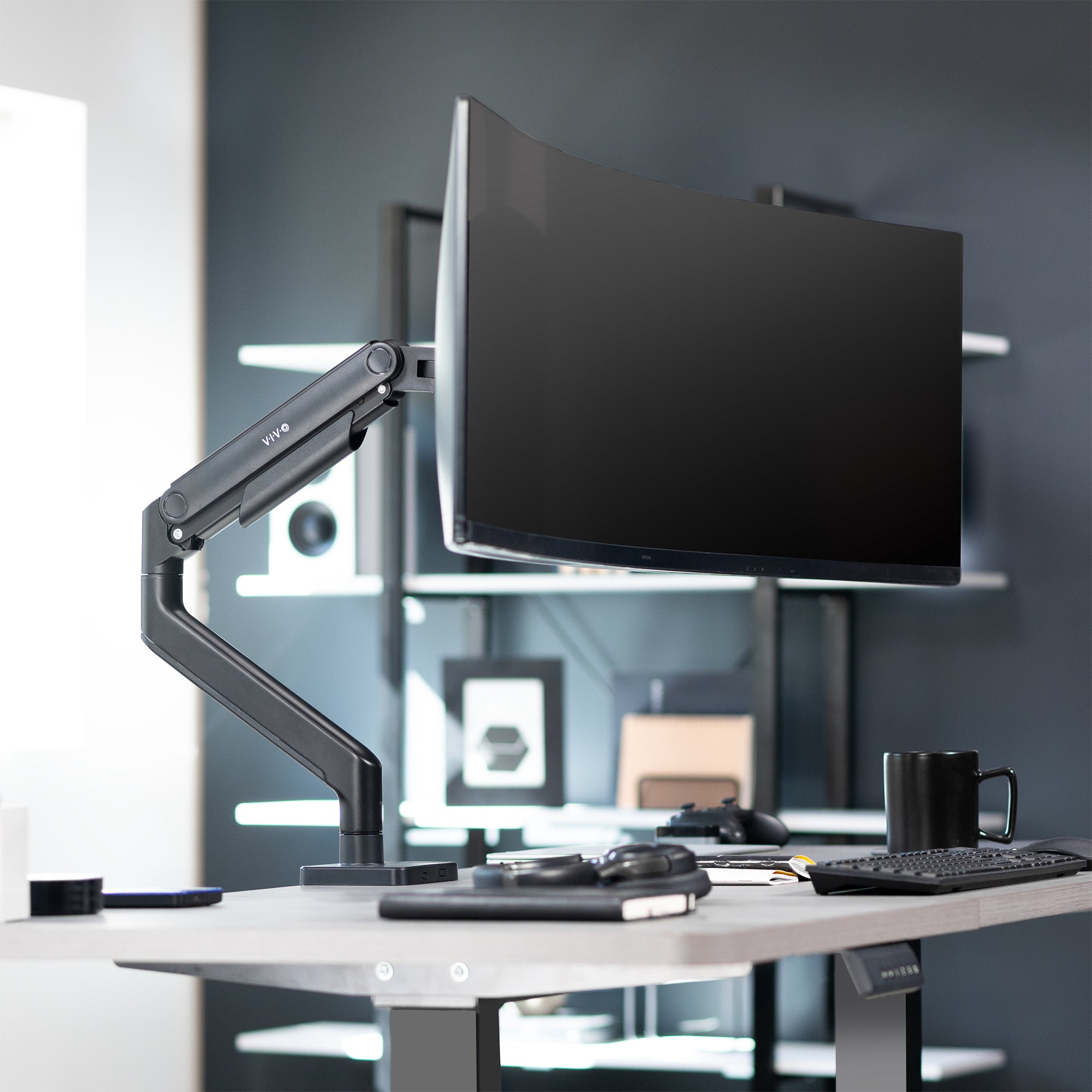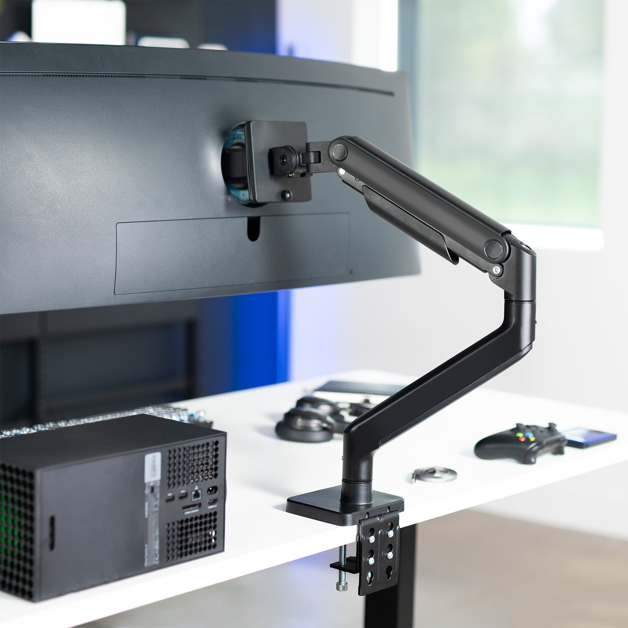 Enhance your gaming experience with the Tension Spring Arm Single Ultrawide Monitor Desk Mount (STAND-V101E Series) from VIVO! The ultimate ultra-wide mount for gamers and content creators alike, this premium stand perfectly counterbalances the weight of your 17” to 40” monitor (up to 44 lbs) for optimal ergonomic positioning. Featuring high-quality aluminum construction, flexible joints, screen articulation, smooth height adjustment, a sturdy desk clamp and grommet mount, integrated cable management, and more, this monitor arm is ready to transform your workspace. All hardware and instructions are provided for easy assembly, so you can get your stand secured and ultra wide monitor mounted in no time!